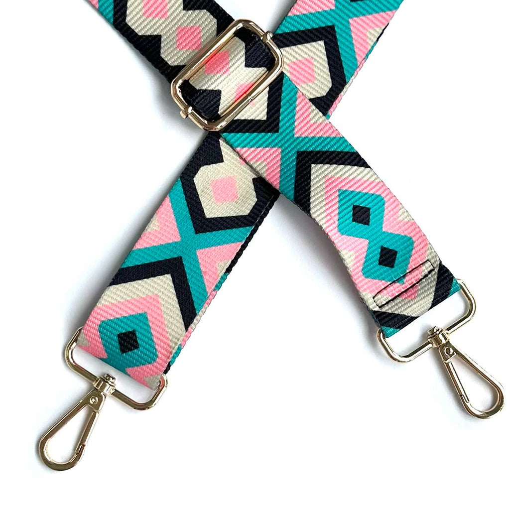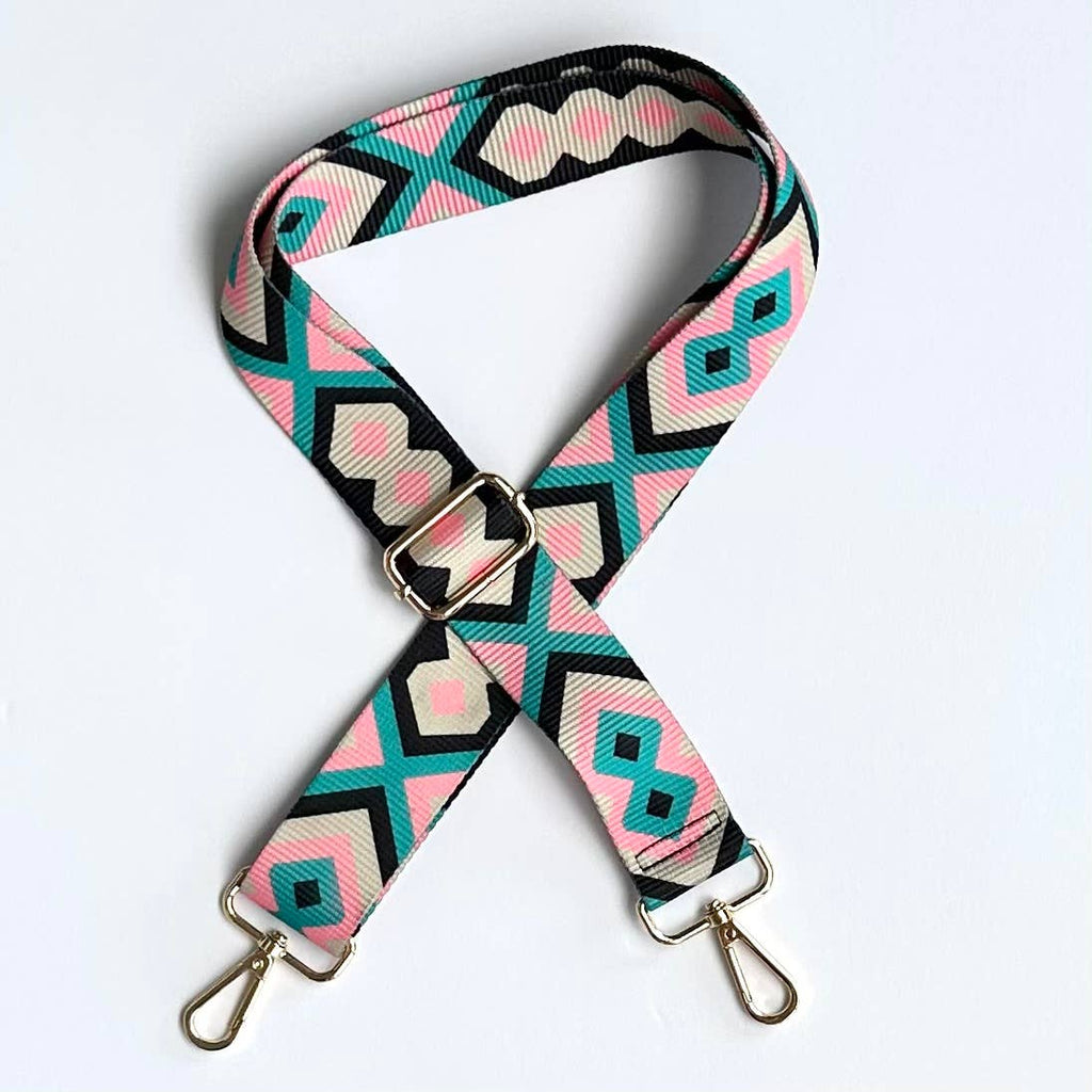 Give your crossbody bag a new life with this guitar strap. Perfect jacquard all season pattern with light pink, black, aqua and beige colors to match any of your outfits!